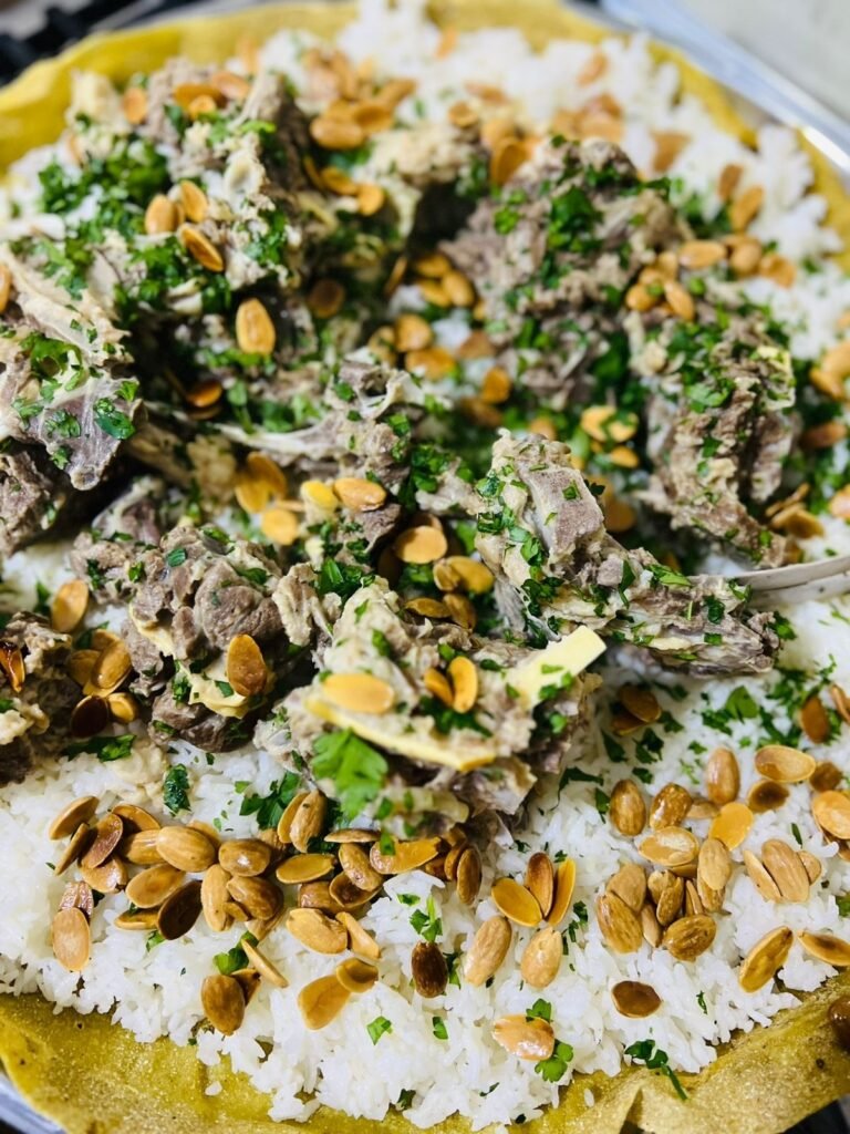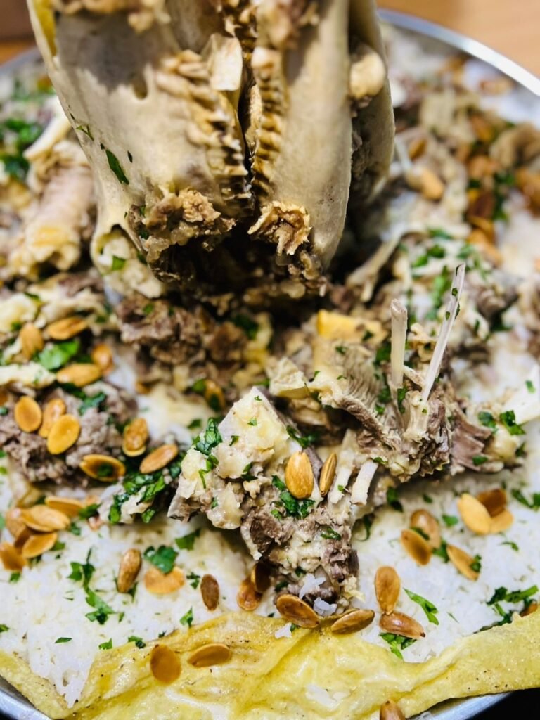 سيمفونية النكهات الأردنية “استعد لتذوق واحد من أغنى الأطباق العربية نكهة ودسامة. يعتمد المنسف الأردني على مكون أساسي وحصري وهو ‘الجميد’ (حجر اللبن المملح والمجفف) الذي يُذاب ليصنع مرقاً أبيض كثيفاً يُطبخ فيه لحم الخروف حتى يصبح طرياً للغاية. تُسكب هذه الصلصة الساخنة فوق طبقات من خبز الشراك الرقيق والأرز ذو الحبة القصيرة، وتُكلل هذه اللوحة الفنية بالسمن البلدي والمكسرات المحمصة، لتقدم لك تجربة تذوق تذوب في الفم.”